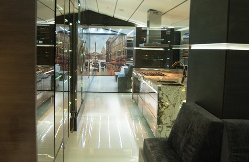 ample living room with golden marble. This Stunning pent-house has a marble full kitchen with a big fridge & big freezer. The living room has a great sound system with lights in the roof that you can control in a monitor. 6 Tvs. one big tv in the living room.