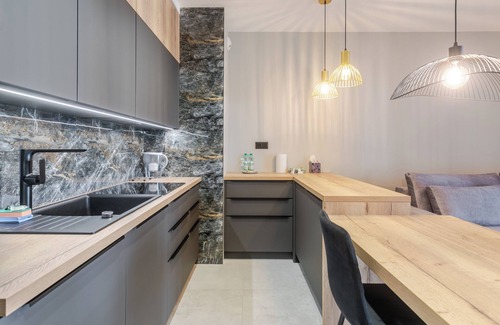Szybowcowa Oasis Apartment consists of a living room with a sofa bed, a kitchenette, a bedroom with a double bed, a bathroom, and a spacious balcony where guests can relax and enjoy their morning coffee or an evening glass of wine. The apartment is equipped with Wi-Fi, a television, a dishwasher, a refrigerator with a freezer, an induction hob, an oven, a microwave, and a kettle. Additionally, the apartment includes an iron, a vacuum cleaner, a hair dryer — as well as air conditioning, which ensures comfort during warmer days. Guests can also use a parking space in the underground garage.