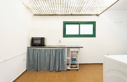 La cocina, integrada en el salón, está totalmente equipada: cafetera, placa de gas, tostadora, hervidor, batidora, microondas y horno. Desde aquí se accede a un área auxiliar con lavadora y secadora, perfecta para estancias más largas.