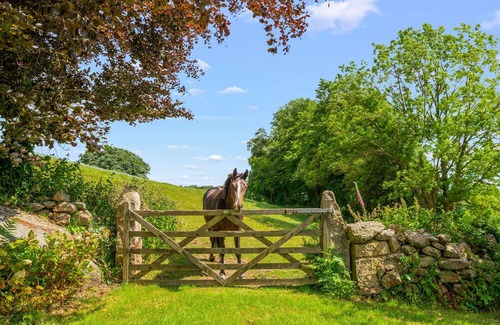 French doors lead out to your own private lawned garden, ideal for morning coffee, complete with a Webber barbecue and firepit. Guests also have access to the shared on-site natural plunge pool, outdoor kitchen complete with barbecue, wood burning stove, pizza oven and fridge.