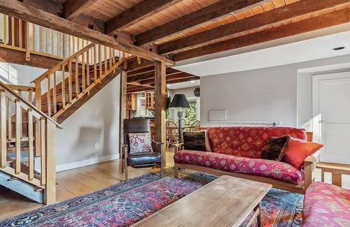 Take it easy at this unique and tranquil getaway. Our cabin is the perfect space to relax after a day of skiing, hiking, tubing, antiquing or exploring Bethel. Our cabin features a cozy wood stove, sauna and hot tub. There is a spacious kitchen and three comfortable bedrooms. We welcome families and well-behaved dogs!
