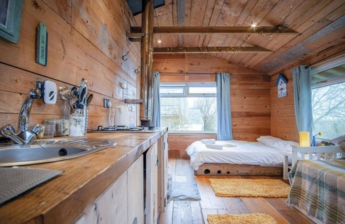 Inside, The Hygge Hut features a well-equipped kitchenette and a modern bathroom complete with a refreshing walk-in shower, toilet, and hand basin. The Hygge Hut boasts a cosy double bed ensuring a peaceful night's sleep. For cooler evenings, a log burner inside offers a warm and inviting atmosphere, creating the perfect setting for relaxation and rejuvenation.