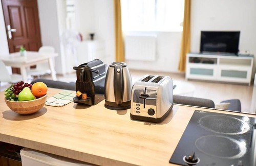 A kitchenette with a mini fridge, vitroceramic cooktops, Nespresso coffee machine, kettle, microwave, toaster, oven, dishes, and kitchen utensils.