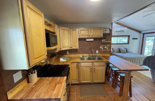 This cabin is located in the heart of the Ozarks on the banks of the famous White River. Known for its outstanding trout fishing! It is newly remodeled with a modern decor and has a very cozy feel. This cabin was once a part of The Rdbud Resort in the 1960’s. The cabin features a full kitchen, a 43” TV, an electric fireplace and an oversized picture window showcasing a breathtaking view of the river.