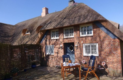 El "tiempo de espera" es parte de una finca con techo de paja a la vista del dique frente a Sylt y está estructuralmente conectado al antiguo edificio estable y al 'Friesenhaus' al lado.