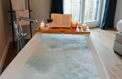 Vakantieappartement met vrijstaand bad met uitzicht op bos en meer.