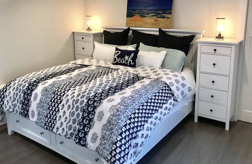 La casa se encuentra al final de un tranquilo Cul De Sac y tiene un amplio patio lateral con césped ideal para que los niños jueguen. Pase tiempo columpiándose en el porche delantero mientras los niños suben y bajan en bicicleta por el camino tranquilo. Justo al lado de la cocina en la parte posterior de la casa hay una terraza privada de gran tamaño que ofrece una gran parrilla y mesa de comedor para 8 personas. El patio, un escalón más abajo, tiene una hoguera rodeada de Adirondacks. ¡También puede disfrutar de una ducha exterior cerrada y caliente cuando regrese de la playa antes de entrar a la casa!