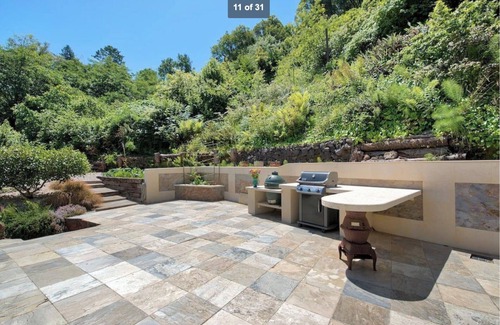 The home is on a quiet and wooded dead-end lane with only 9 houses above it -- extremely peaceful. Virtually no traffic. There is an orchard with an apple tree (Pettingill variety), two plum trees (grafted, with dapple dandy, flavor queen, pluot, and Santa Rosa varieties), pineapple guava, an aprunia tree (cross between apricot and plum), Meyer lemon tree, fig tree, avocado tree. There are also berry bushes: boysenberry, black currant, blueberry, and blackberry. Many different herb plants line the stone steps up to the patio for the home chef. The huge outdoor patio has two grills: one gas Weber, one wood Green Egg, plus a large outdoor counter, outdoor dining table with 8 chairs. Relax in style and comfort in 2 chaise lounges.