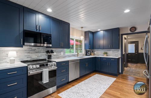 The first floor includes a convenient King Bedroom (King Bed - Two Twin XL Beds pushed together), perfect for guests who prefer to avoid stairs. You'll love the charm of the winding staircase and the modern, fully equipped kitchen that makes cooking together fun and easy. The open floor plan gives everyone plenty of room to chat, share meals, and relax. There's also a cozy sitting room in the front of the house where you can unwind, read, or just enjoy the view of peaceful pine trees outside the window. The breakfast area faces the patio and fills with morning light, a great spot for coffee or an evening cocktail. Washer and dryer is also located on the main floor, along with a large living room and dining room.