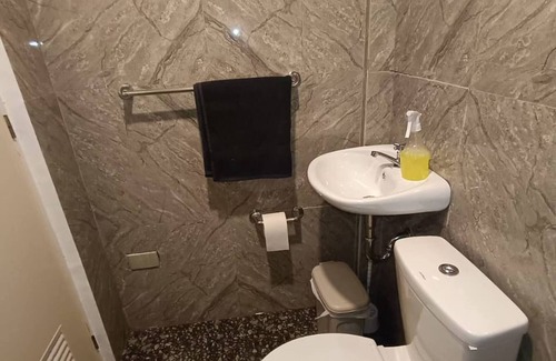 Baño: Limpio y funcional con ducha, inodoro y lavabo.