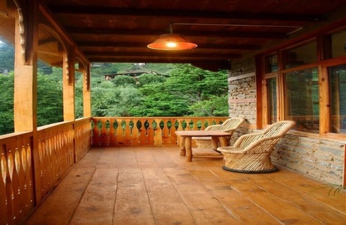 Continuando con la tradición de la arquitectura Himachali de madera y piedra y respetuosa con el medio ambiente, la habitación tiene paredes enlucidas de barro, armarios de madera, asientos profundos en las ventanas y balcón cubierto con pisos de madera. El agua caliente es de calentador solar.