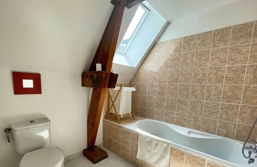 1 salle de bain familiale à l'étage avec poutres apparentes avec baignoire/douche, toilettes et lavabo