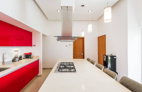 Comienza tu día en una cocina moderna, completamente equipada, con una isla perfecta para preparar el desayuno y compartir momentos especiales. Afuera, te espera una hermosa alberca privada con jacuzzi a temperatura ambiente, rodeada de camastros, regadera exterior y un comedor al aire libre que invita a relajarte y disfrutar el clima tropical sin prisas.