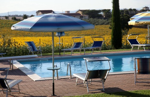 El Apartment Maestrale se encuentra en la floreciente campiña de Val di Chiana y está rodeado de exuberantes olivos, girasoles y un encantador jardín de cipreses.