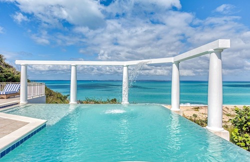 The interior's tasteful sea-inspired decor, in whites with touches of turquoise, complements the view. The great room, with floor to ceiling glass doors, flows from the seating space into the charming French-style kitchen which faces the sea. Dine inside on the kitchen's marble high top or in the splendid glass conservatory just off the kitchen; the view is the perfect backdrop for beautiful meals.