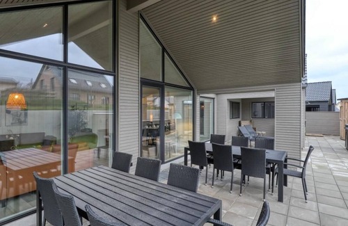 This modern pool house, accommodating up to 14 people, sits near Trams am See in beautiful northern Germany, just a stone\'s throw from the water. Ideal for families or friend gatherings, it boasts a spacious kitchen and living area where aromas from the modern kitchen permeate the space, complemented by a long dining table for shared meals and conversations. A cozy sofa area invites relaxation and movie nights. For recreation, there\'s an activity room equipped with billiards, darts, and table tennis, perfect for family tournaments. Afterward, guests can unwind in the pool area or outdoor wellness zone, featuring a whirlpool and sauna, melting away daily stresses. Outdoors, a terrace with garden furniture and barbecue offers al fresco dining while children enjoy the play tower, swings, and trampoline. The accommodation includes five bedrooms and two lofts, catering to both adults and children, with two bathrooms ensuring convenience for all.
