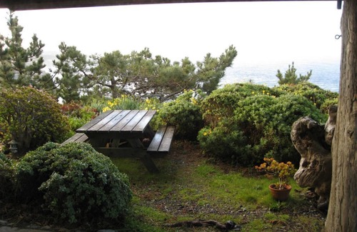Nuestra casa fue construida en la ladera oculto, incorporando materiales naturales que fueron arrastrados hasta la orilla, como enormes pilotes de madera, trozos de madera, conchas, estrellas de mar, piedras de río locales, boyas de cristal viejas y antiguas anclas de barco que se suman al encanto. Las plantas nativas y las flores silvestres cubren el acantilado que domina el mar.