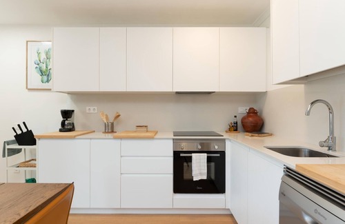 Cocina y salón: una cocina moderna y diáfana integrada en el salón, equipada con horno, microondas, lavavajillas, cafetera italiana y americana, kettle, exprimidor, tostadora, placa eléctrica, entre otros. El amplio y luminoso salón cuenta con smart TV con una cuenta abierta de Netflix y un elegante sofá de piel.