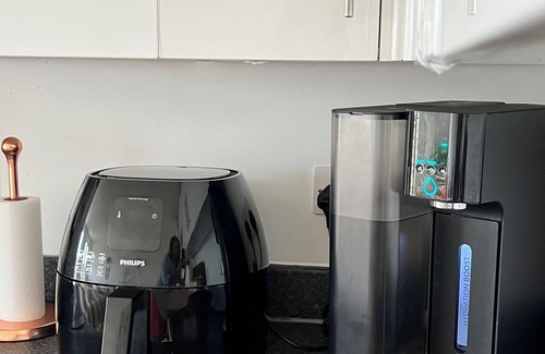 The bathroom includes a bathtub and a water filter. There is a reverse osmosis water filter in the kitchen, an air fryer, kettle, fridge/freezer and a washing machine.